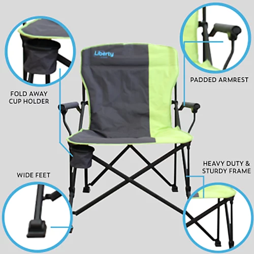 The Liberty folding chair s the perfect addition to your camping or garden gear. Designed for both comfort and durability, this folding chair features a heavy-duty steel frame and extra-wide feet to prevent sinking into soft ground.