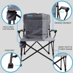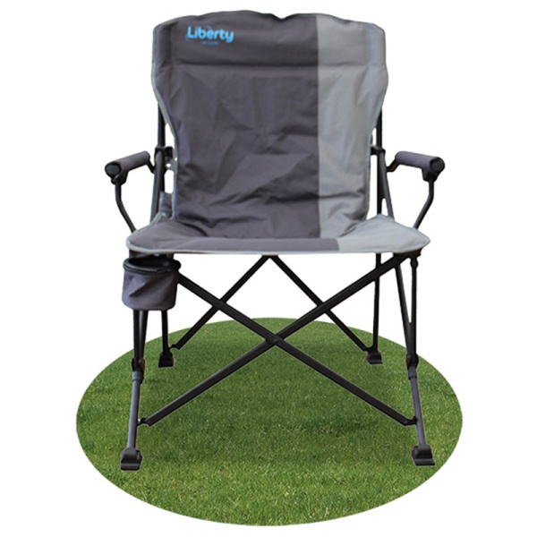 Liberty Folding Camping Chair – Grey The Liberty Folding Camping Chair in grey is the ideal choice for outdoor enthusiasts seeking comfort and durability. Designed for camping, caravanning, and garden use, this chair features a robust steel frame that supports up to 110kg. The padded armrests and wide feet provide added stability on various surfaces, ensuring a comfortable seating experience without sinking into the ground. A convenient folding cup holder allows you to keep your drink within reach while relaxing. With its folding design, the chair is easy to transport and store, making it perfect for on-the-go adventures. The stylish grey colour complements any outdoor setting, while the high-quality materials ensure longevity even with frequent use. Features Heavy-duty steel frame supporting up to 110kg Padded armrests for enhanced comfort Wide feet for stability on soft surfaces Folding cup holder for added convenience Compact foldable design for easy transport and storage Comes with a carry bag for portability Specifications Dimensions: 104cm (H) x 50cm (W) x 65cm (D) Weight: 6.6kg Colour: Grey and Black Maximum Load Capacity: 110kg SKU: LLFC-2